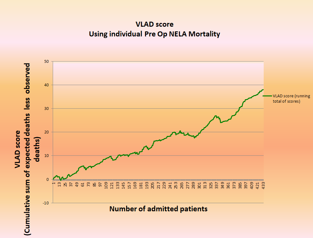 If the acute surgery service was performing as expected, the green line would run flat along the bottom of the graph. Every upstroke represents a patient that survived against the odds, every down stroke is a patient that died unexpectedly and a horizontal line is a patient whose outcome was as expected.