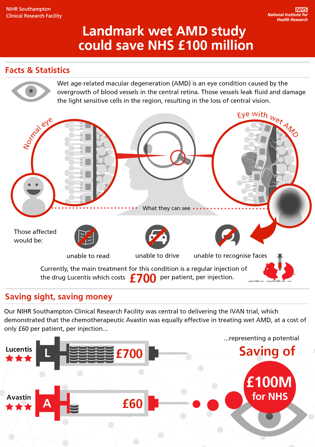 Southampton’s NIHR Clinical Research Facility was central to a UK-wide trial demonstrating that the eye condition wet age-related macular degeneration (AMD) can be treated with a drug 10 times cheaper than the current treatment, representing a potential saving of £100 million per year.