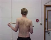 - Elbow bent to 90° and held comfortably by side, back of hand placed against wall